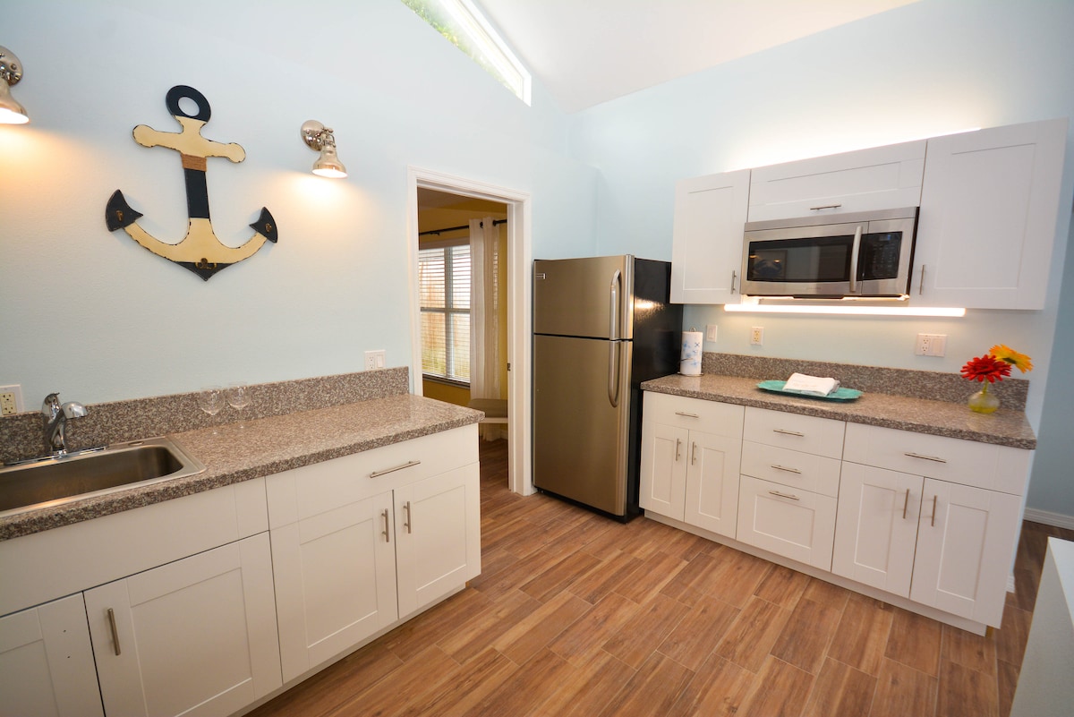 A/C, ,Kitchen has fridge/freezer, toaster. Coffee maker K Cup, single induction hot plate. Cups Plates Silverware, and glassware.