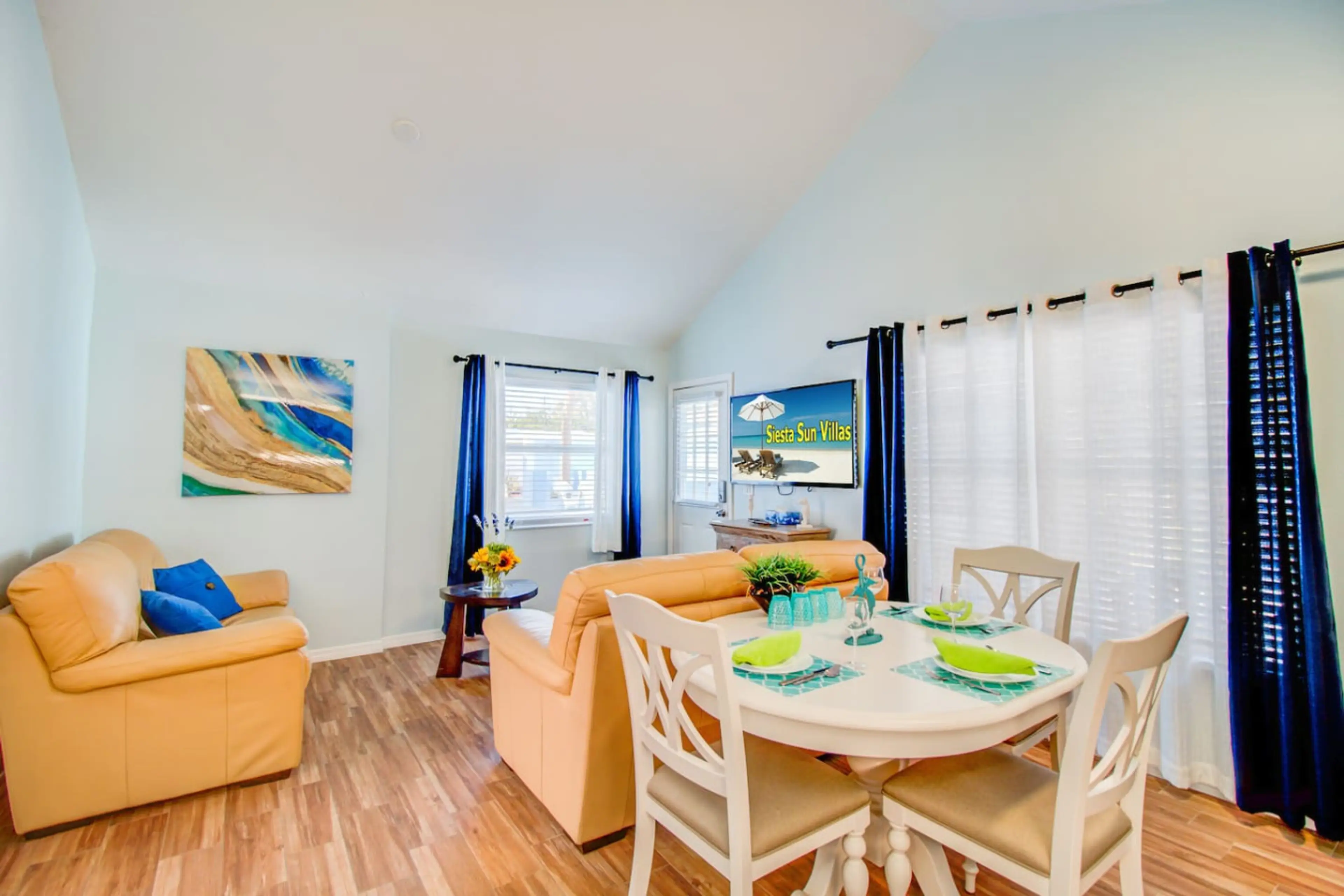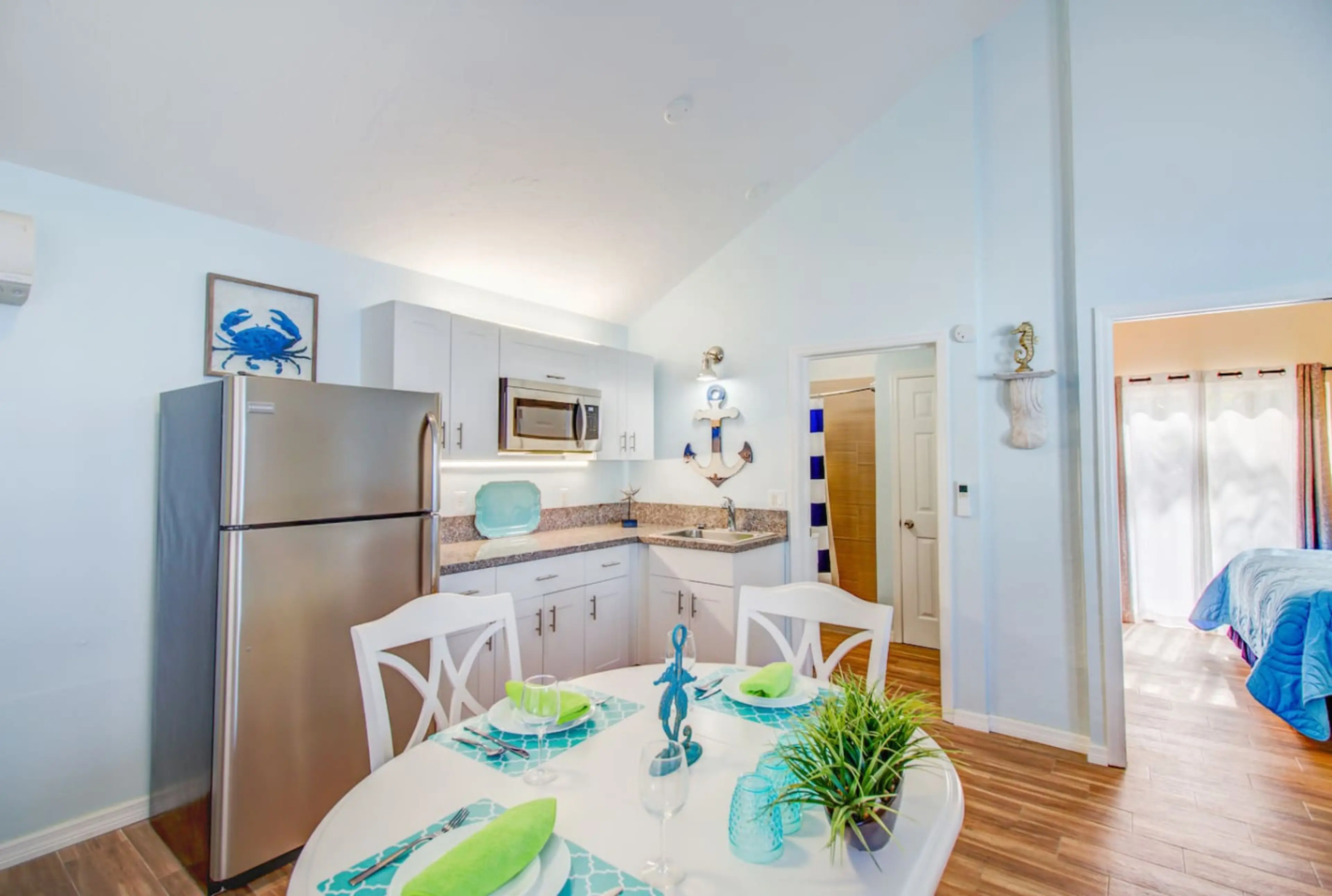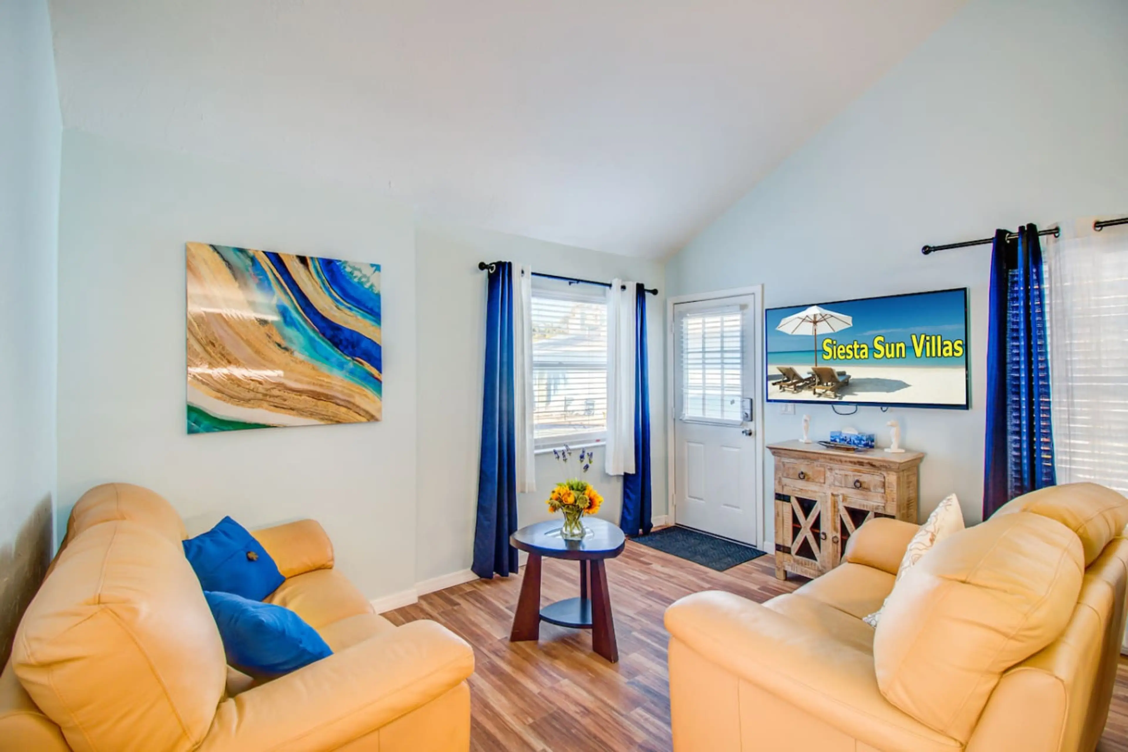 Villa 1 is a ground floor end unit. You have your own private entrance. With self check in key pad Featuring 1 bedroom, 1 bathroom, large living room with SMART TV, A/C, Kitchenette with stainless steel appliances ,Granite counter tops, Fridge Freezer. Separate bedroom with King Bed, Free wifi .Fr...